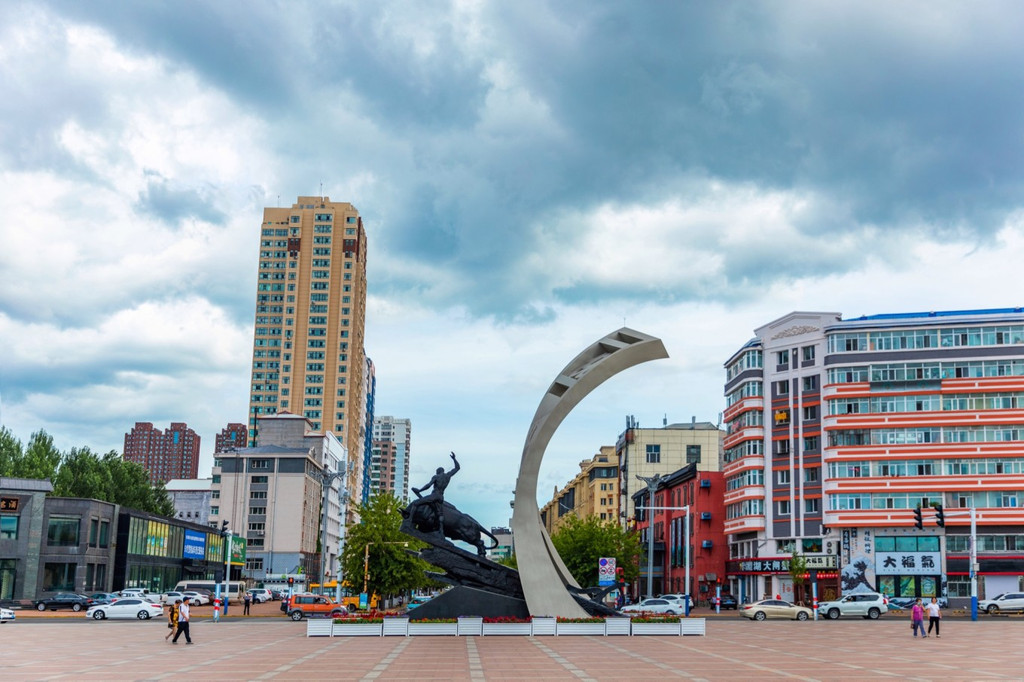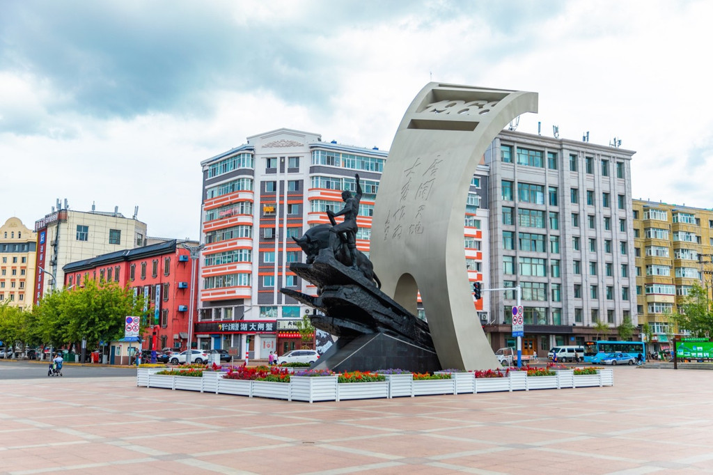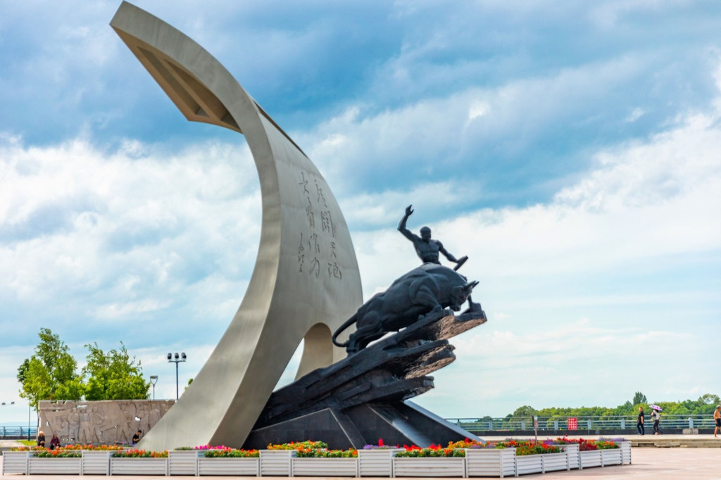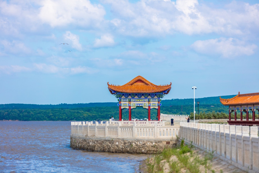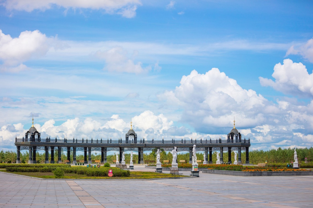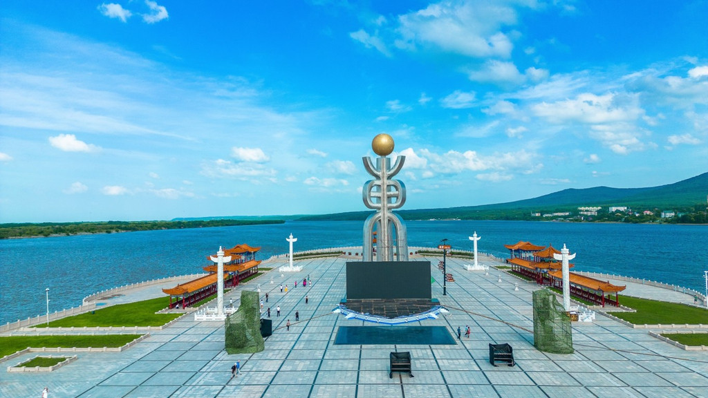 广场占地面积很大,有太阳亭、游廊、华表、水榭、游船码头、汉 白玉 围栏等,都是典型的东方建筑。站在这里视野开阔,可以看到对岸 俄罗斯 的卡扎克维茨沃镇。