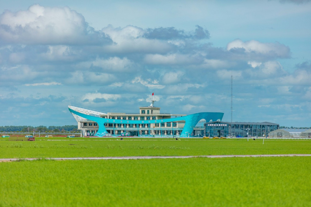 不远处的建筑如同一艘航母航行在茫茫稻海中,它是运用农业物联网、云计算、大数据、移动互联网等现代信息技术手段建成的“ 富锦 市现代农业综合信息服务平台”,堪称现代农业航母的缩影。