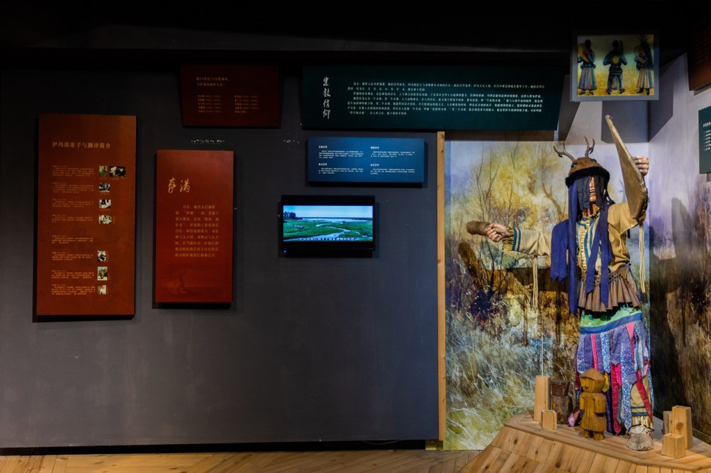 除了传统鱼皮生活装,赫哲人还制作鱼皮宗教萨满服。赫哲族人认为萨满是治疗百病的能手,是“人神之间的使者”。时至今日,他们依旧保留着鱼皮文化、冬捕、萨满祭司习俗。