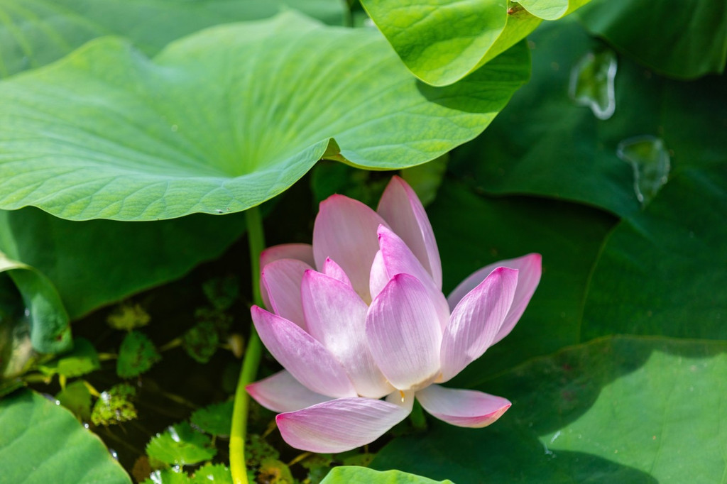我来的时候正是荷花盛开的仲夏,步入荷花池,荷叶田田,荷风扑面,荷香萦绕。池塘里这一朵朵粉红色的荷花,像一位位穿着粉红衣裳的少女,头上戴着黄色的莲蓬,静静地站在那里。一阵风儿吹来,这些少女们就翩翩起舞,看起来生机盎然。