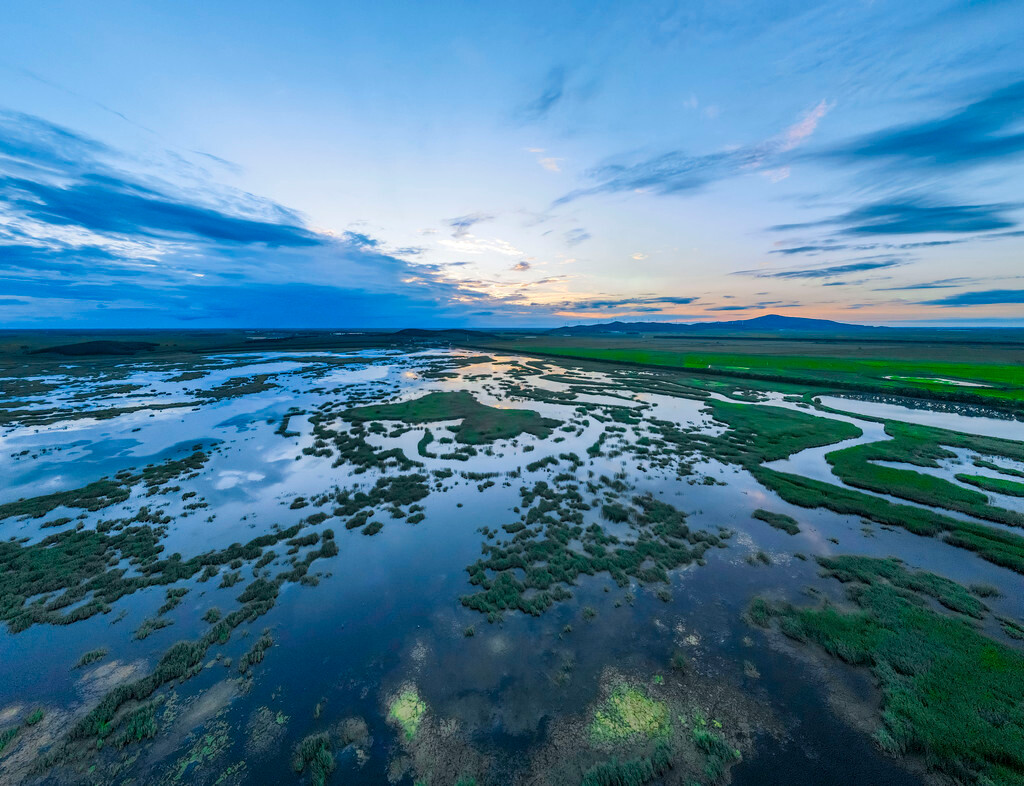 三江 口湿地泡沼遍布,河流纵横。植被以沼泽化草甸为主,并肩有岛状森林分布,从高空的视角看出去,水系与一片绿盎然所交织。