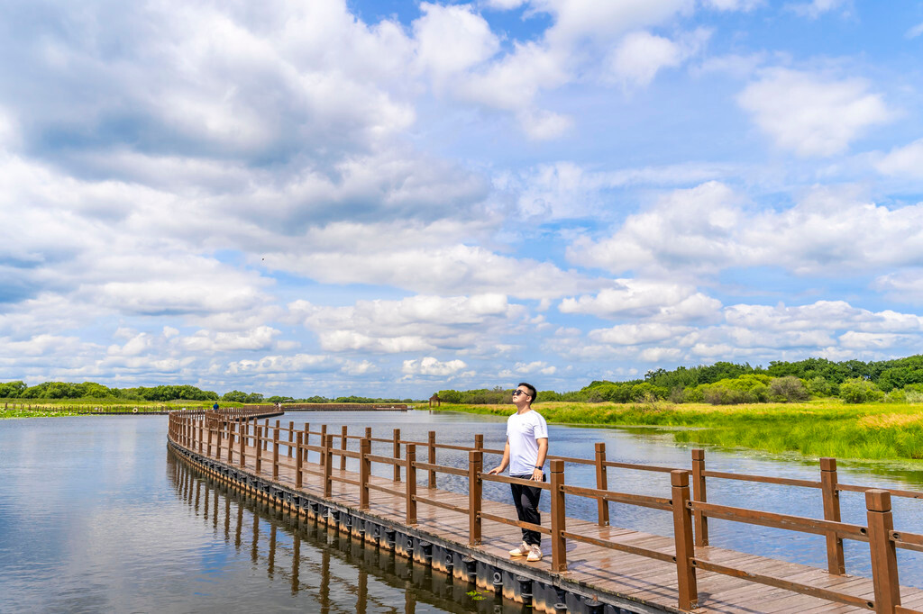 值得一提的是,这里的木栈道设计非常巧妙,采用浮筒式的设计,水涨桥涨,水降桥降,而且浮桥没有穿过湿地的一草一木,原本的湿地水系之间没有受到任何阻隔,做到了真正的开发和保护!