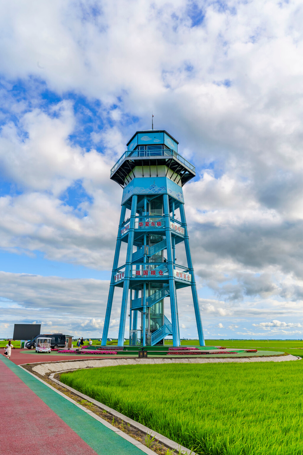 登上万亩水稻公园中央的观景塔,便可以俯瞰四幅环塔的3D稻田画作。