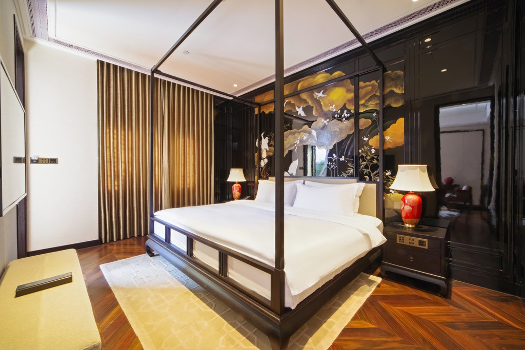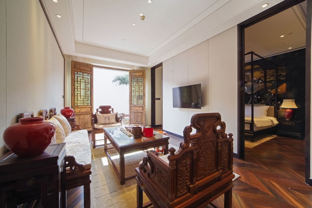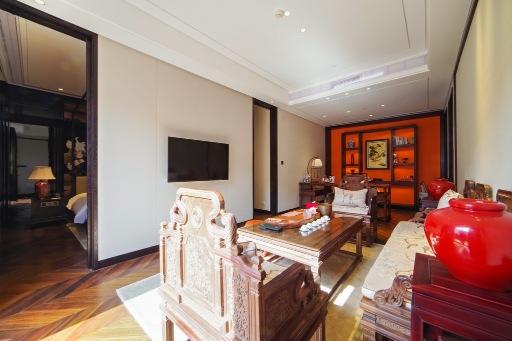 用名家字画,大漆艺术品作为装饰,深沉、含蓄又雅致不俗