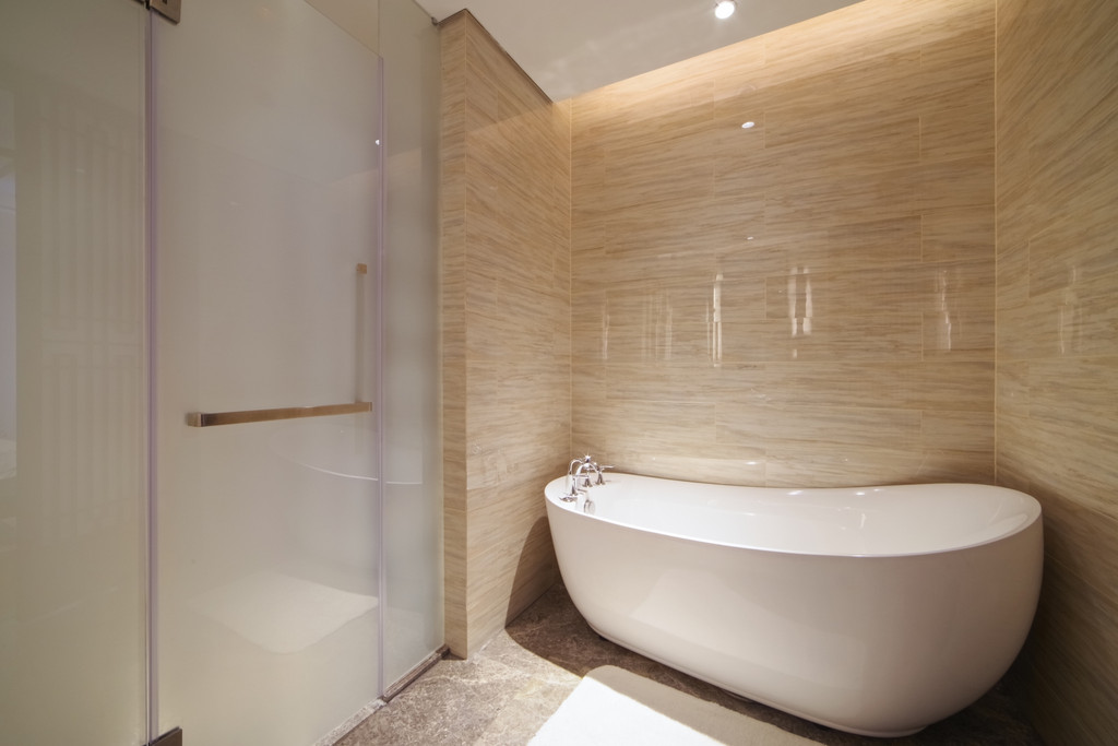 曲线圆润的浴缸使整体空间延展开来,适合泡一场热水澡