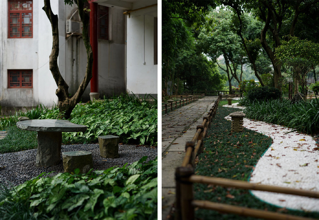 将桌椅融于树影婆娑,簌簌响声隐约在耳畔,更是一种只可意会的美:客来,稍停,或赏山水书画