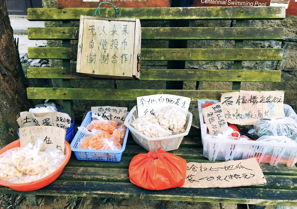 自助菜摊上无人卖菜,人们自觉投币,透着一股人情味儿