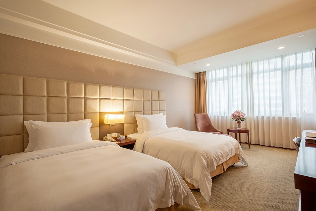 房间宽敞明亮,色调主要由米色、白色、香槟色构成,典雅大气有情调,丝毫没有压抑感。