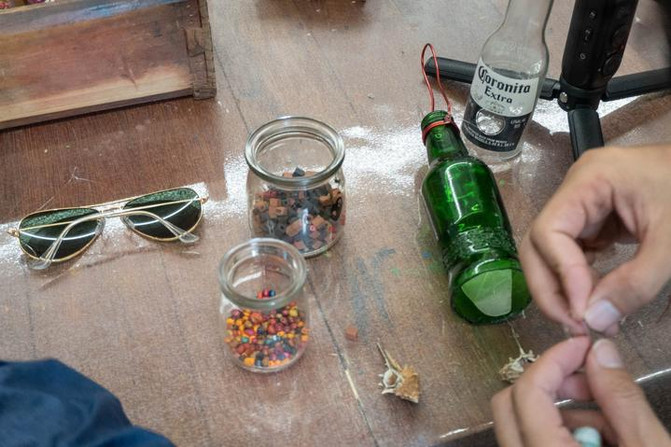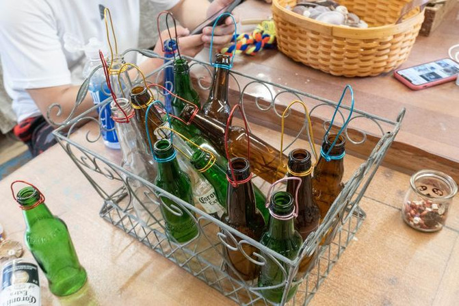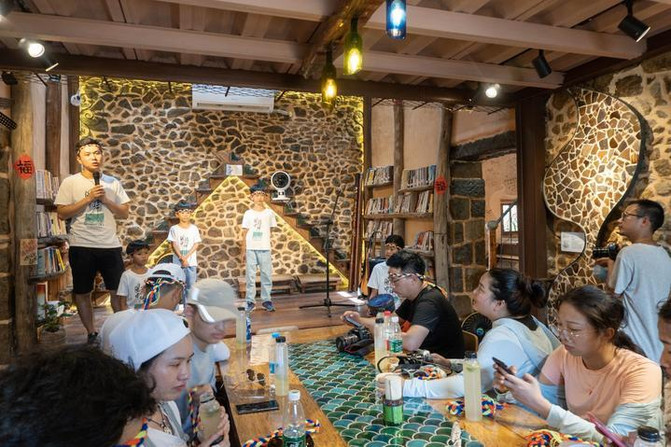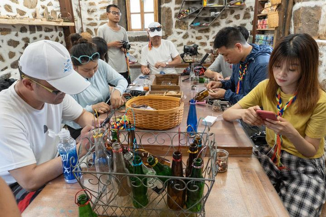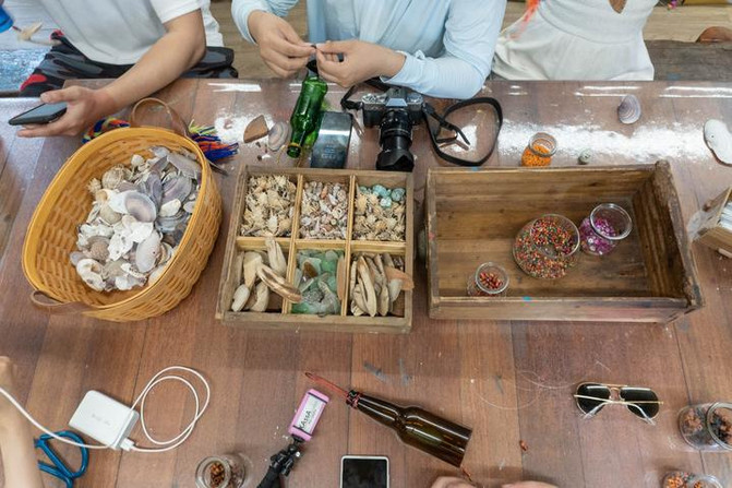 游客也可以在此体验手工制作,亲自动手创作多样的文创作品。我们大家一起动手完成了手工风铃的diy,由这里的小朋友和老师亲自教我们做贝壳风铃。