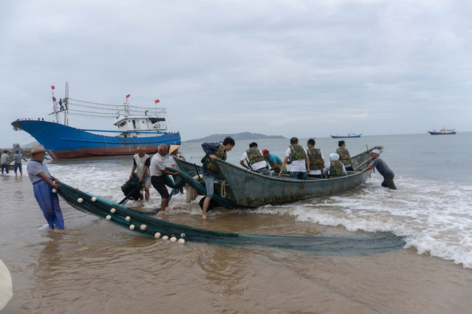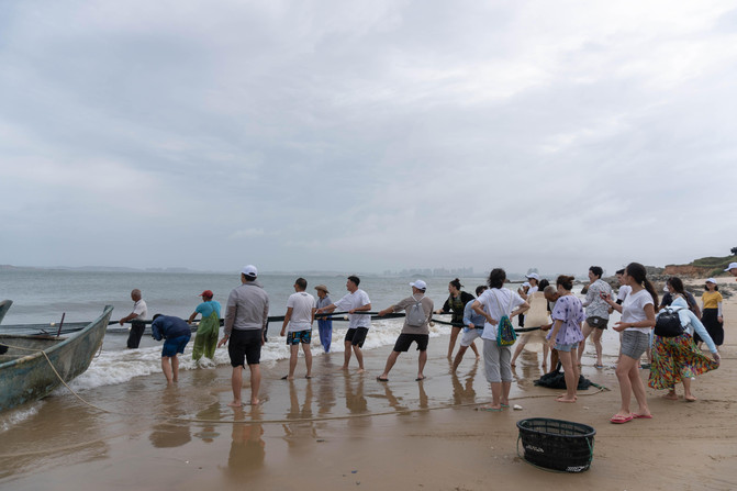 乘船在海湾放下渔网,随后大伙一块把网拉上岸,就可以看到我们的收获啦。