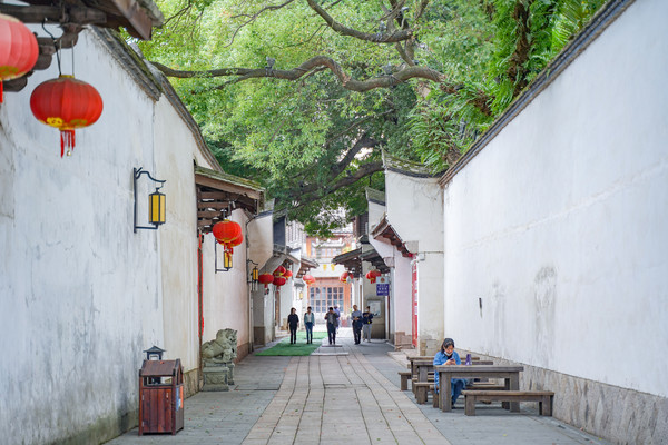 郎官巷坐落着严复故居,沿着悠长的巷子走走停停,感受严复先生来时的路,两侧的建筑雕栏玉砌,大红灯笼高高挂起,久违的烟火味让人流连忘返。如果走累了,不妨倚栏小憩,看看花草,逗逗鸟儿,闲适涌上心头。