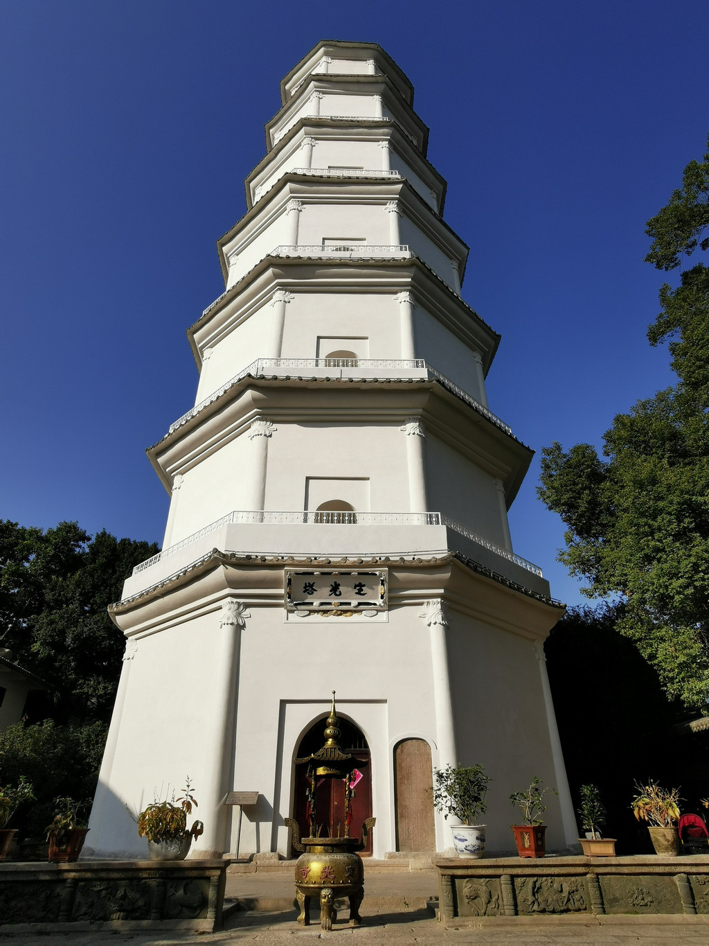 白塔高41米,七层八角,外敷白灰。历史上曾多次毁坏重建,最近一次大修是2020年,当年国庆节重新对外开放。