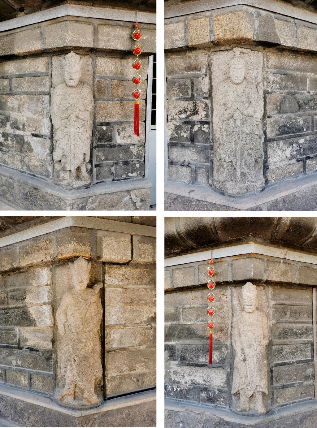 塔身第一层八角各立一尊金刚,着盔披甲,各执剑、铜、牙铲以及宝珠、铃铎、琵琶、凉伞等法器。