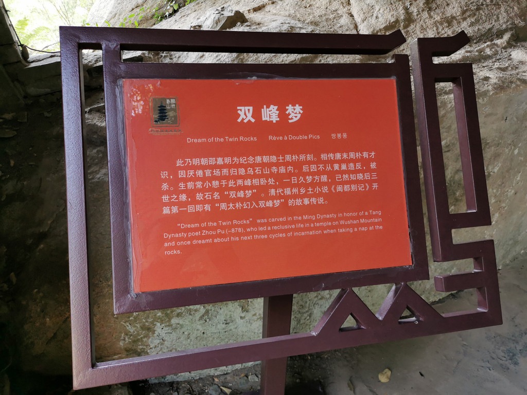 双峰梦,为纪念唐末隐士周朴所刻。相传周朴厌倦官场,归隐乌石山寺庙,后因不从黄巢造反被杀。生前曾小憩于此两峰相卧处,一日久梦方醒,已知晓后三世之缘。