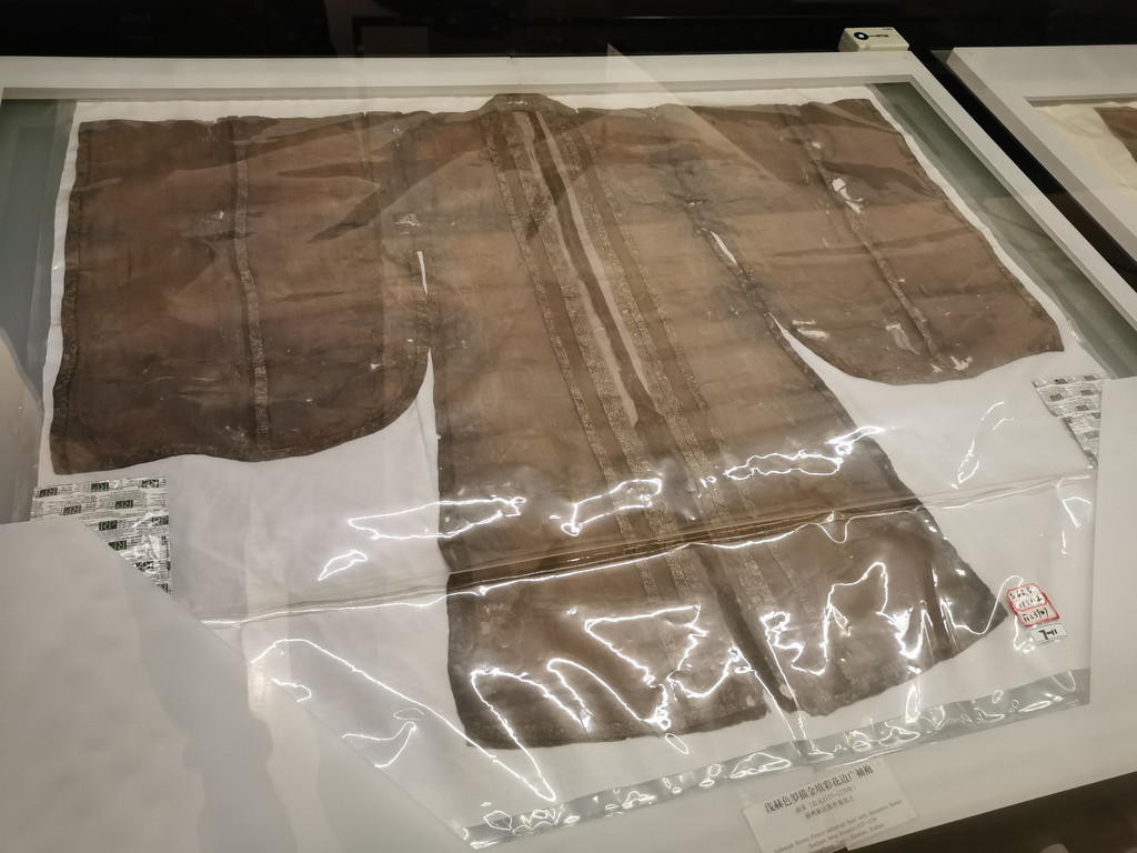 浅褐色罗描金填彩花边广袖袍(南宋)。精致的描金填彩花边设计,展现了古代精湛技艺。出土于南宋淳祐三年(1243)黄昇墓,墓中服饰和丝织品达353件,包括纱、罗、绮、绫、缎等品种。