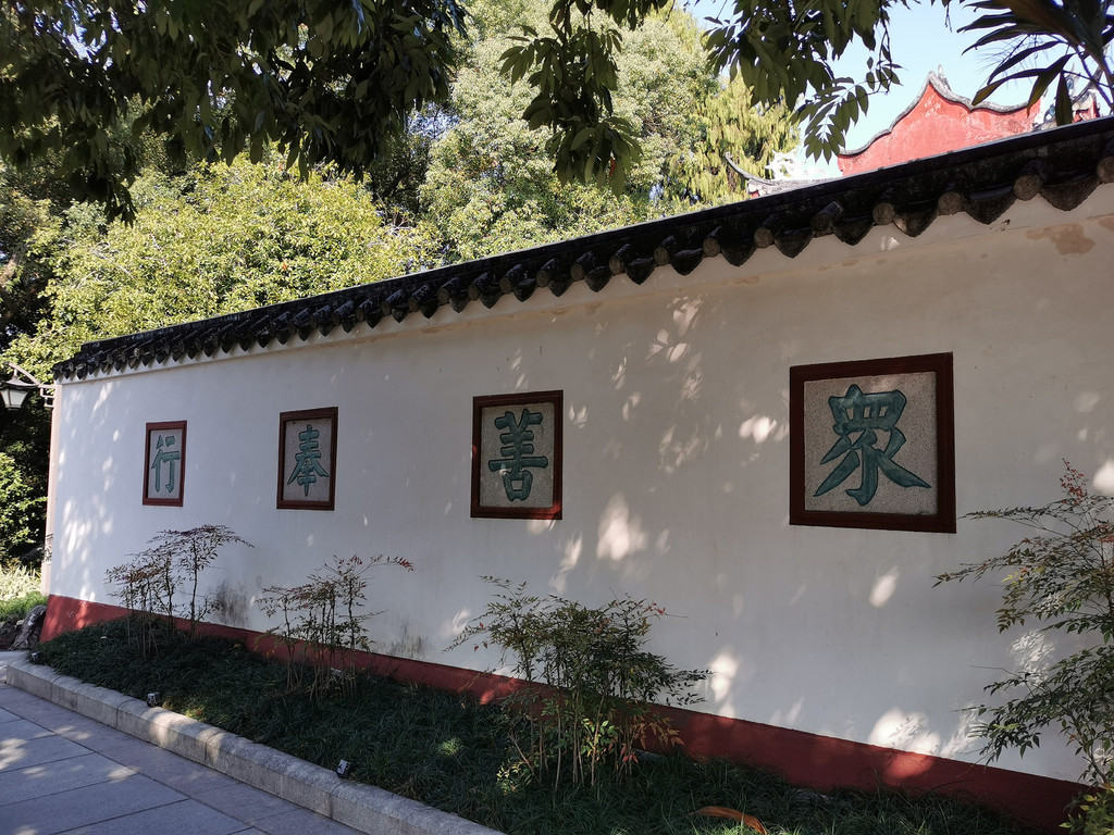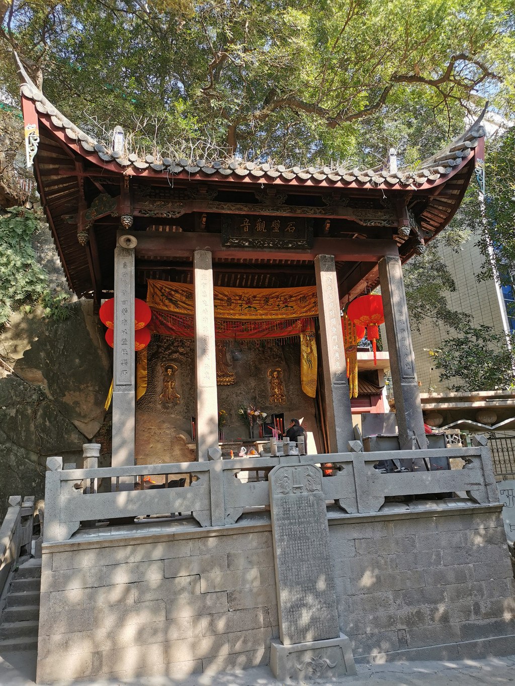 石壁观音。相传此处原有一天然岩石,在1000多年前遭雷火袭击,岩壁上显现隐隐约约的站姿观音像,另有两尊左右旁立。后人据此加工成浮雕的观世音像。