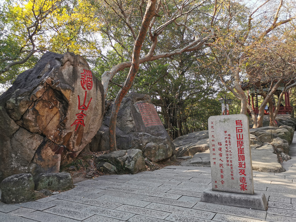 乌山位于乌塔公园内,海拔84米。相传汉代何氏九仙在重阳节登山揽胜,引弓射乌,故名乌山,又称“射乌山”。唐天宝八年(749年),唐玄宗敕名“闽山”。宋代熙宁年间,郡守程师孟以此山可与道家蓬莱、瀛洲相比,改名“道山”。山虽然不高,但很有特点,山上除了众多的殿、寺、庙、亭、台、楼、阁,还有200多处摩崖题刻,篆体、隶体、楷体、行书、草体都有,堪称福建名人的“签名簿”。