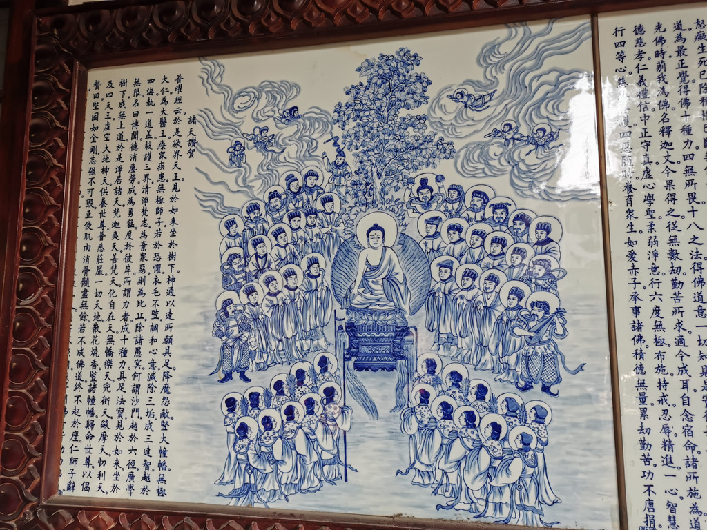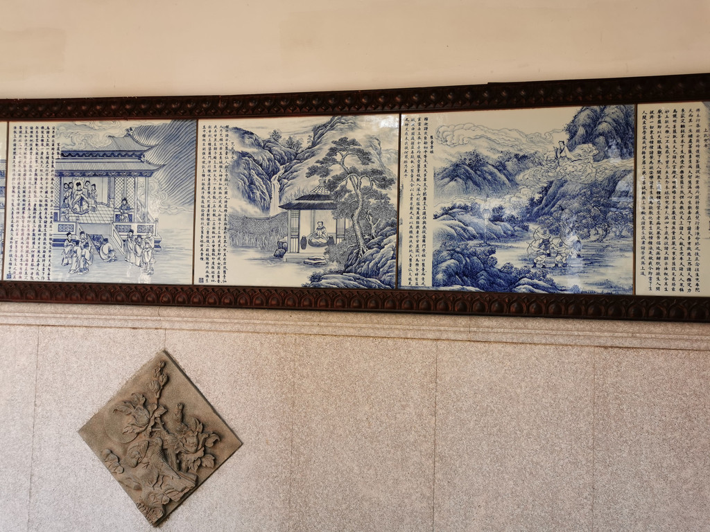 青花瓷画廊,长250米,由200多块瓷画拼成,讲述佛教传说,从释迦牟尼诞生一直演绎到“白马驮经”佛教传入中国为止。