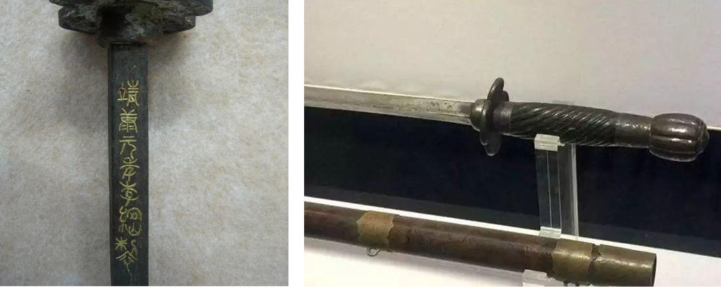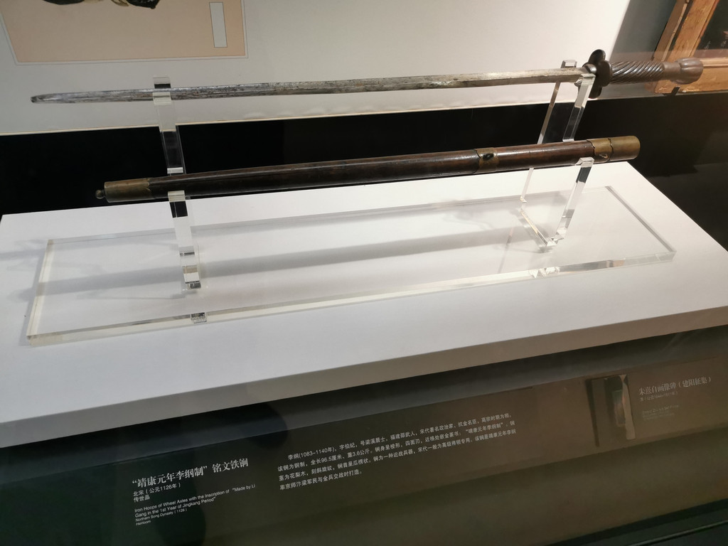“靖康元年李纲制”铭文铁锏(北宋)。目前我国发现最早的古锏。通高96.5厘米,鞘长76厘米,重3.6千克。锏身配有圆形红木套鞘,鞘体镶嵌银饰花卉、蝙蝠、古罄、垂缨络等图案,错金篆书“靖康元年李纲制”一行7字。锏是一种长而无刃的短兵器,很重,杀伤力较强,隔着盔甲也能将人砸死,一般在马战上使用。史载,靖康元年,京城四壁守御使李纲曾率汴京军民与金兵展开殊死搏斗,击退金兵,该锏是李纲请人专门打造用来御敌防身。