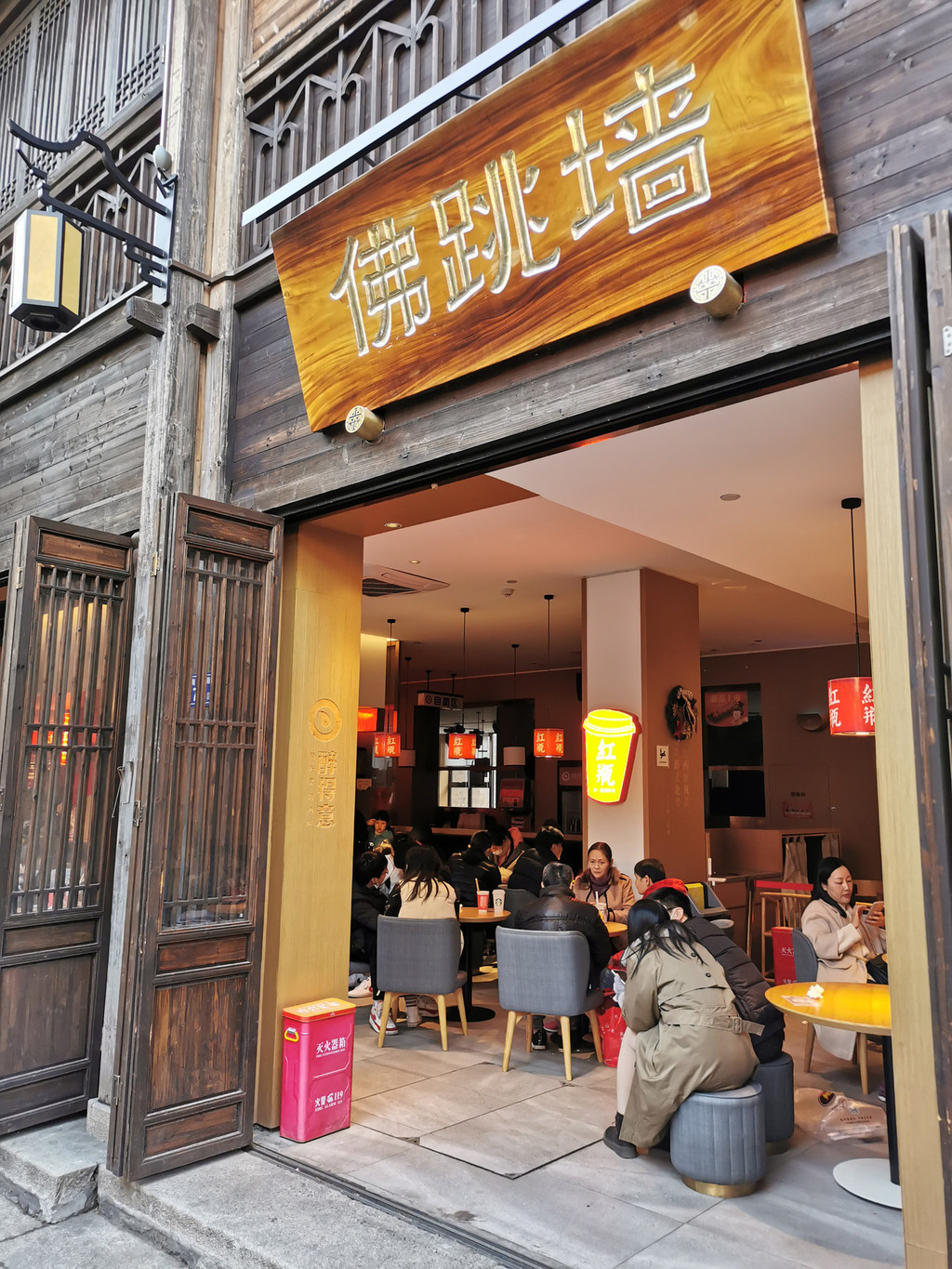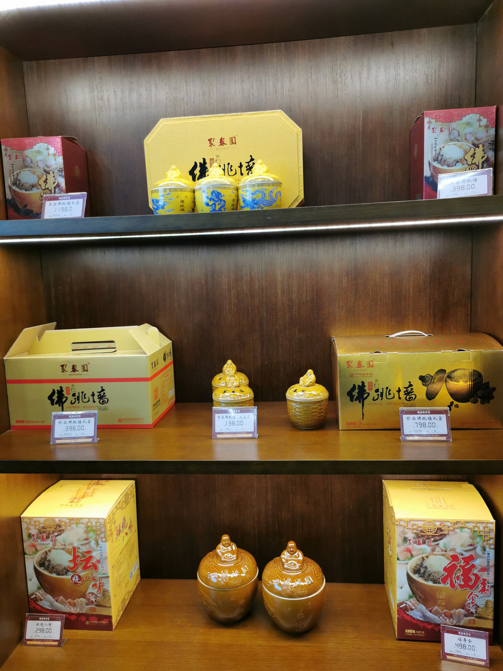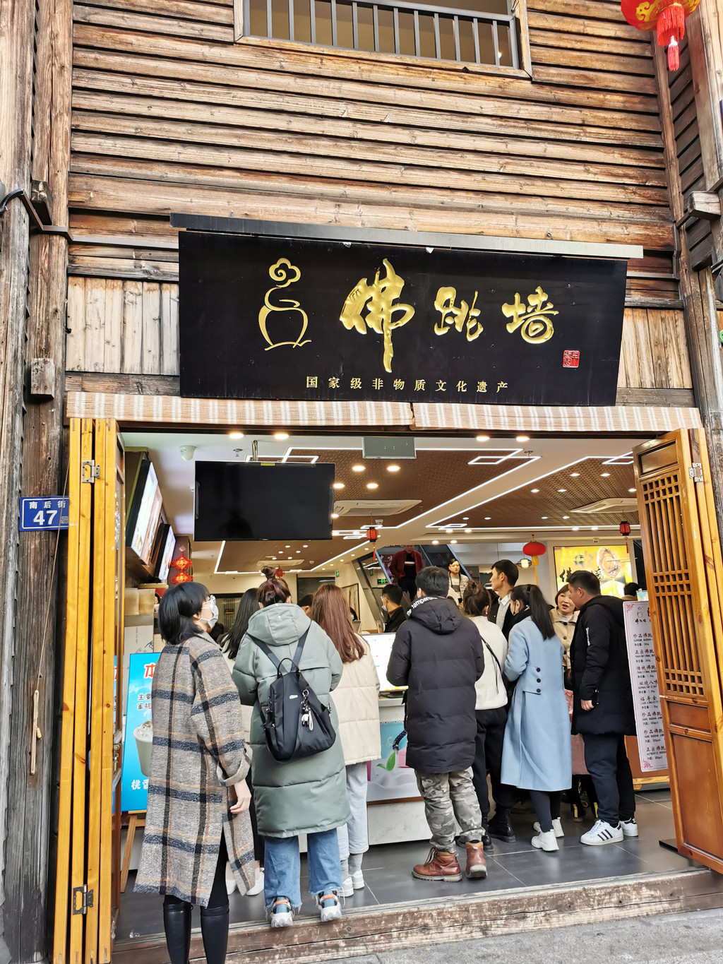 佛跳墙又名福寿全,是福州一道特色名菜,据说清朝道光年间由福州聚春园菜馆老板郑春发研制。通常选用鲍鱼、海参、鱼唇、牦牛皮胶、杏鲍菇、蹄筋、花菇、墨鱼、瑶柱、鹌鹑蛋等食材,加入高汤和福建老酒,文火煨制。煨成开坛之时香味四溢,直入心脾,连僧人闻了也要弃禅跳墙而来。