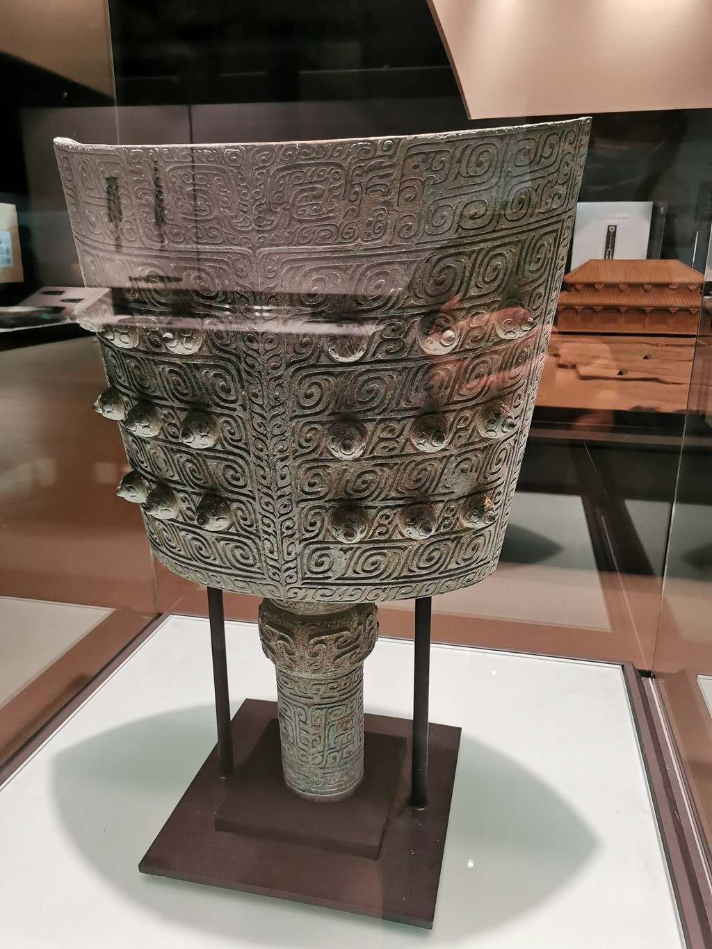 青铜铙(西周)。高76.8厘米、甬长29.8厘米,重100.35千克。研究商周时期福建社会发展水平、民族文化面貌以及与外地文化关联的重要资料。