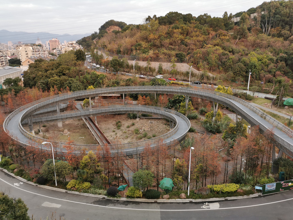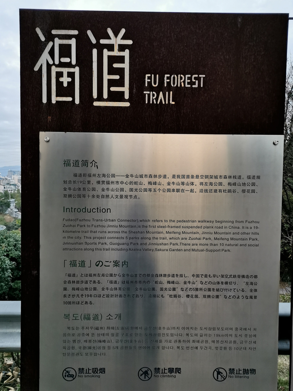 福道,即福州城市森林步道,人行高架路,连通5个公园,有10个出入口。主轴线长6.3公里,环线总长约19公里,东北接左海公园,西南连闽江廊线,中间沿金牛山山脊线,贯穿左海公园、梅峰山地公园、金牛山体育公园、国光公园、金牛山公园。
