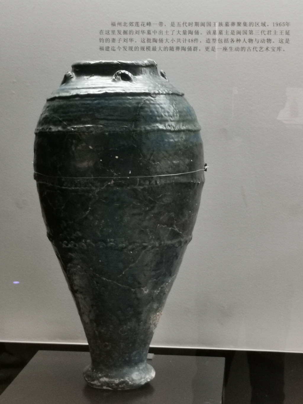 波斯孔雀绿釉陶瓶(唐)。孔雀绿釉是一种以铜元素为着色剂的低温彩釉,起源于古波斯地区。晚唐五代时期,随着海外贸易的频繁发展,从海路传入中国。波斯孔雀绿釉瓶目前国内发现较少,仅福州、扬州发现,对研究波斯古代文化和福州、扬州等地的海外交通史具有一定意义。