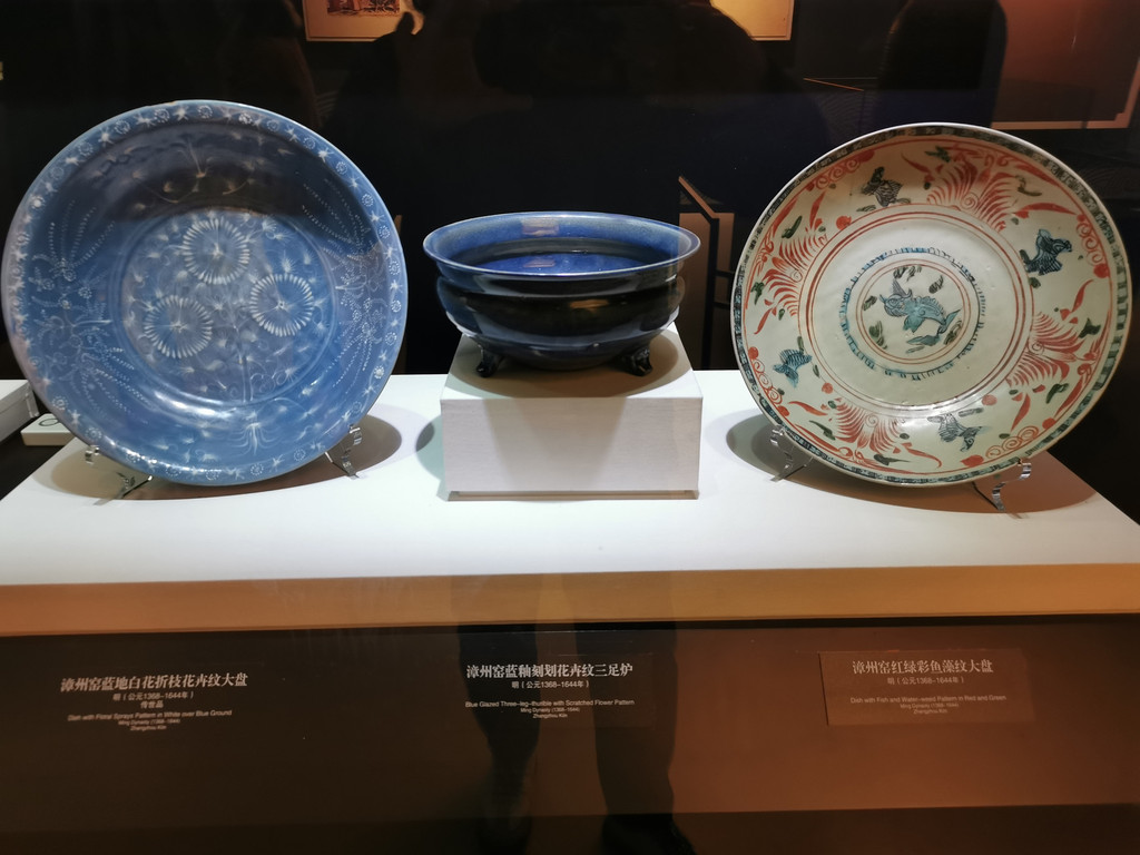 漳州窑瓷器(明)。漳州窑是明清时期漳州地区窑业总称,分布于漳浦、南靖等县,以青花瓷为主,兼有五彩、素三彩等品类,是当时中国外销瓷重要产地。