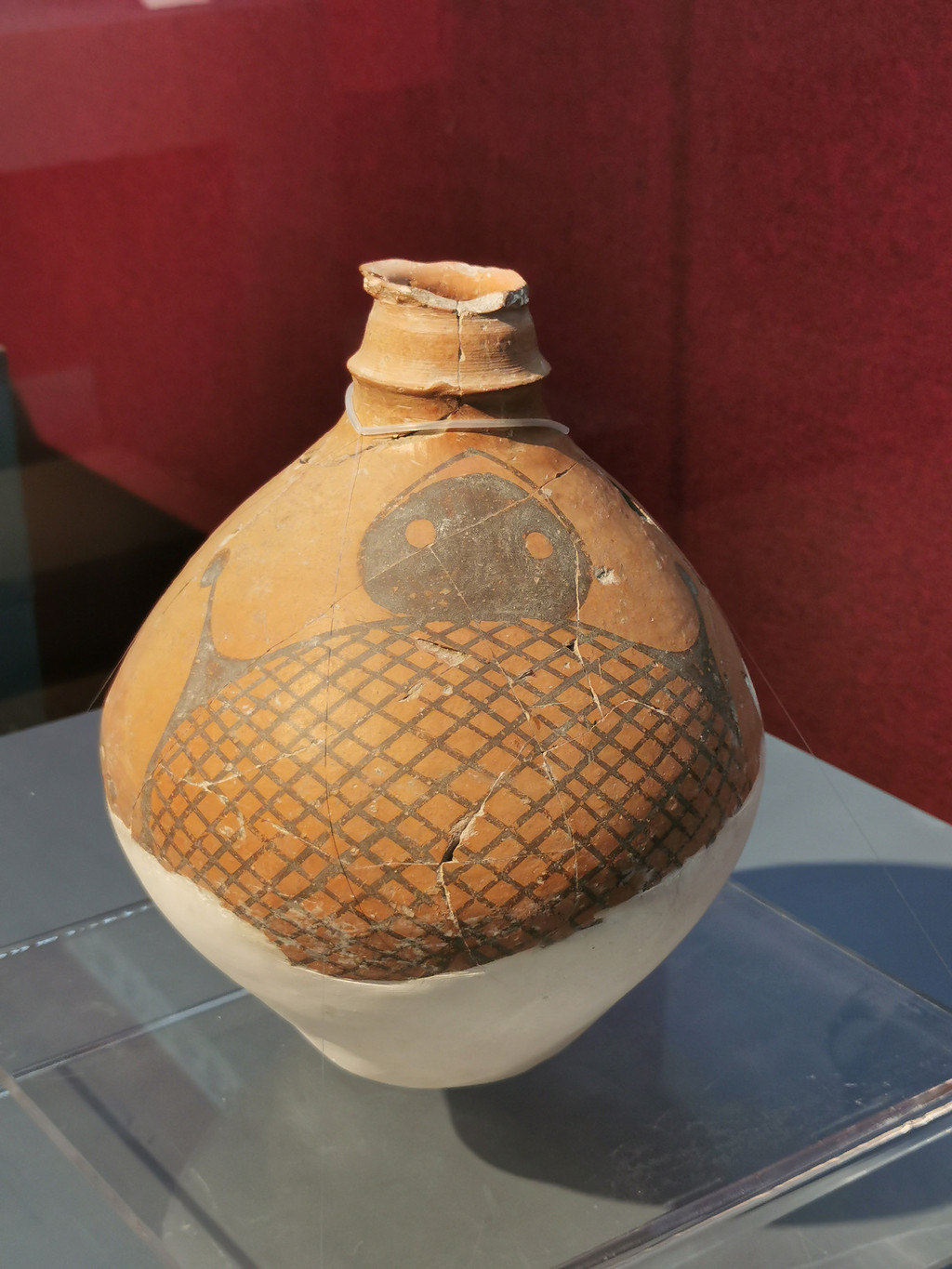 圆圈网纹旋纹彩陶壶(马家窑文化半山类型)。甘肃省博物馆藏。