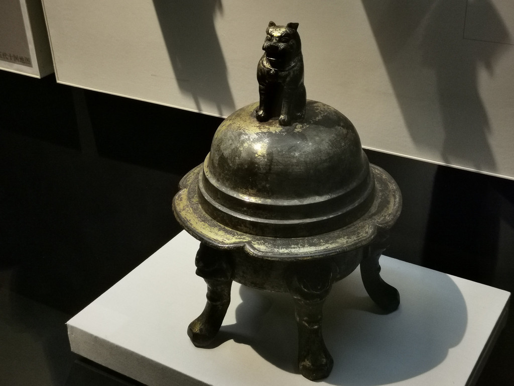 “闽王王延翰”铭铜鎏金狮形香炉(五代)。通高40.1厘米,口径21厘米。顶部有一只蹲着的狮子,狮口与器内相通,便于烟香外薰。炉身边沿刻楷书铭文一周:“弟子盐铁出使巡官、主福建院事、检校尚书、礼部郎中、赐紫金鱼袋王延翰,奉为大王及国夫人铸造师子香炉壹口,舍入保福院,永充供养。天祐四年九月四日题。”这是五代闽国有铭文铸器的一件孤品,纪年明确,为断代和辨伪研究提供了重要实物资料。