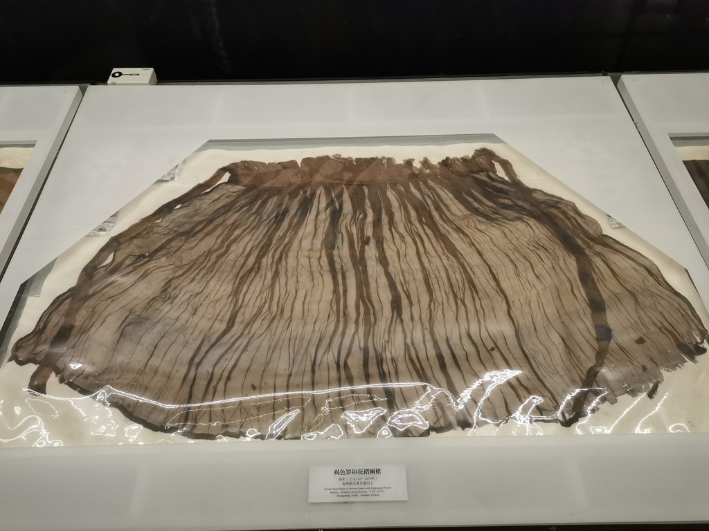 褐色罗印花褶裥裙(南宋)。国家一级文物。裙长78厘米,下摆宽158厘米。由轻薄的丝绸制成,穿越千年能保存如此完好,显示出高超的丝织技艺。