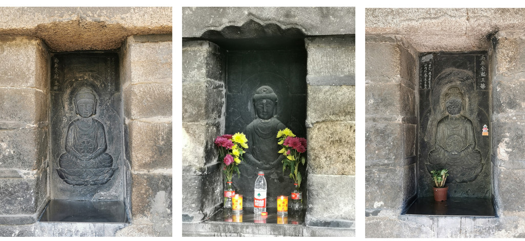 七面塔壁各设供佛石龛,龛中镶嵌黑色页岩浮雕佛像。