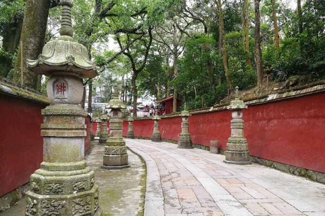 寺庙的大门也很有特色,两侧是红墙,其实没有门,中间是铺着青石的青石路,路并不算太宽敞,初看真不敢相信这是闽中第一古刹,其实人家这里低调,走进去才是大有乾坤。涌泉寺占地1.7公顷,明清建筑风格,依山偎谷。以天王殿、大雄宝殿和法堂三大殿堂为主体,依山势层层上升,共有25座大小殿堂。