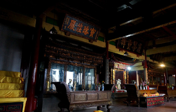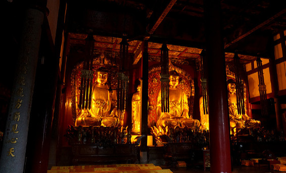 大雄宝殿供奉释迦牟尼三世佛,没有穿梵了,身着汉服,也是很有特点的了。两旁十八罗汉神态各异,法相庄严。大殿后侧是三圣像,前面有一张桑丝木长桌。据说已经历经多次火劫,至今仍完好如初,被称为镇寺之宝。也是涌泉寺继“三宝”之外的“三铁”铁锅、铁树、铁木供桌中的铁木供桌。
