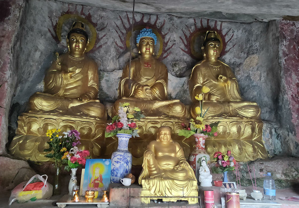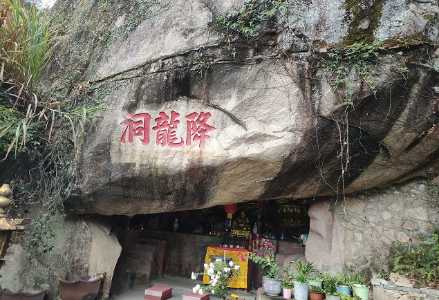 降龙洞形似长龙,龙首正对着灵峤岩,因为岩上刻着“龙首”两个字,所以我们也没有错认。龙腹成洞。传说鼓山的开山祖师灵峤曾在岩下诵经,神龙洗耳恭听,这里就是十八景中的“神龙听经”。走进洞里,其实洞很浅,主供三尊菩萨,弥勒佛笑呵呵地在三尊菩萨之前。
