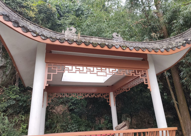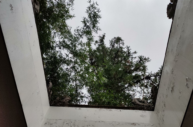 旁边有一座亭子,本来也没有什么稀罕的,只是走进去才发现人家的亭子顶端开了一个长方形的洞,仰头可以看到天空,因此被称之通天亭。名字有点夸张,不过亭子还是有点意思。