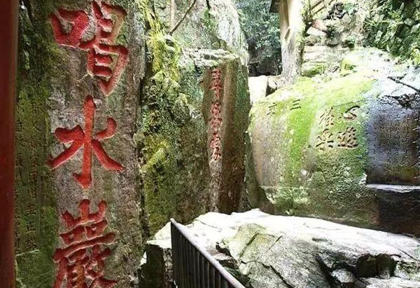 因为旁边有喝水岩的石刻,因此这一带的景点被统称为喝水岩。喝水岩的由来还有一个美丽的传说,相传900多年前,涌泉寺祖师神晏法师在这里诵经,洞下涧水太喧哗,就大喝一声把流水止住。从此,涧水改道,从东侧半山观音阁的石壁涌出,原来的溪涧也就干涸了。