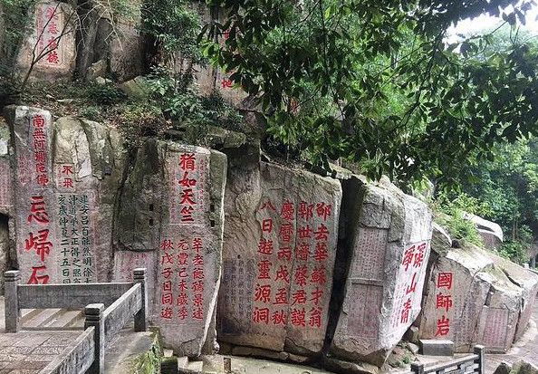“忘归石”是鼓山比较早的一处摩崖石刻,出自蔡襄之手。之所以忘归,自然是因为鼓山的景色太美。后人还因为这三个字写过诗歌,“刚道忘归又归去,白云何不且留人”。