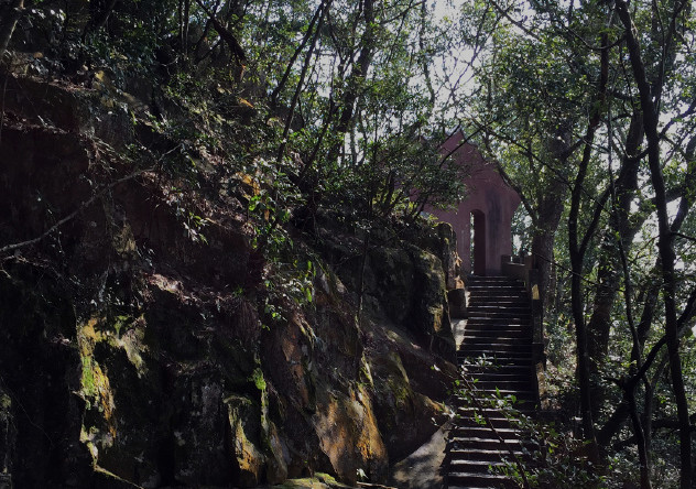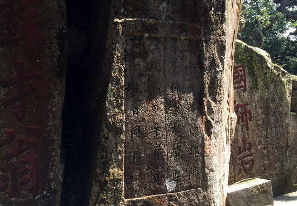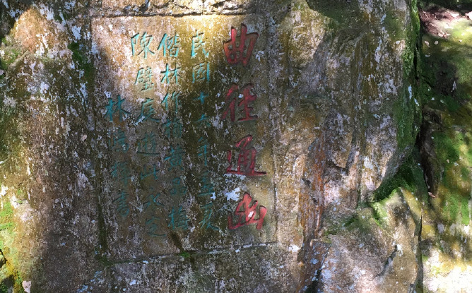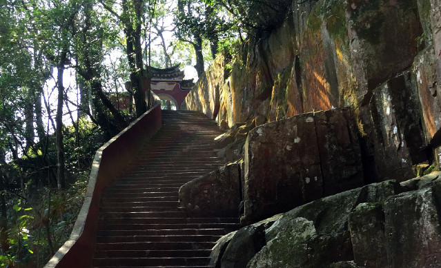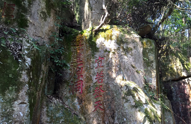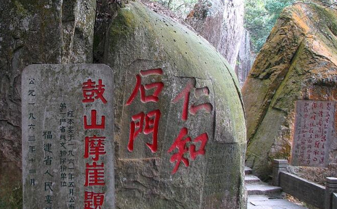 喝水岩往南,有一道石门,两石对立,道窄到只能容一人通过。郭沫若的游鼓山诗镌刻在石门旁,“节届重阳日,我来访涌泉。清风鸣地籁,微雨湿山巅。浮岭多松柏,依山有杜鹃。考亭遗址在,人迹却萧然。”国画大师刘海粟也留下了“胜于天竺”的题刻。