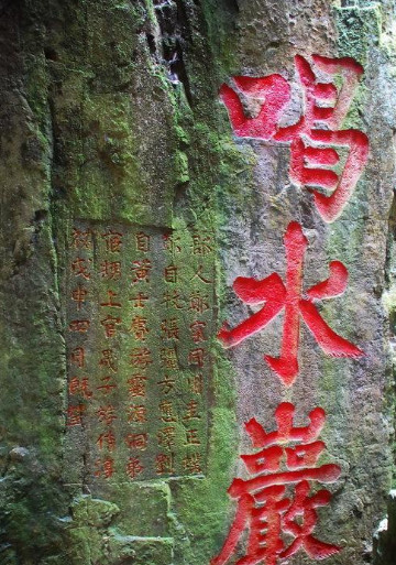 “喝水岩”三个大字就刻在灵源洞弥勒阁旁这 峭壁上,字灵源洞蹴鳌桥下的岩壁上有一个正楷“寿”字题必,字径67厘米,楷体,由宋嘉佑六年施元长所题。字高4.15米,宽3.05米,落款“嗨翁”。这个落款听起来很陌生,但会过意来就会肃然起敬,因为嗨嗡就是朱熹啊!寿字石刻是福建最大的古代摩崖石刻之一,福州地区还有福、康、宁四个大字,以寿字最大也最出名,估计也是因为作者的关系。