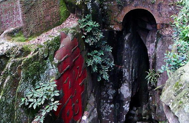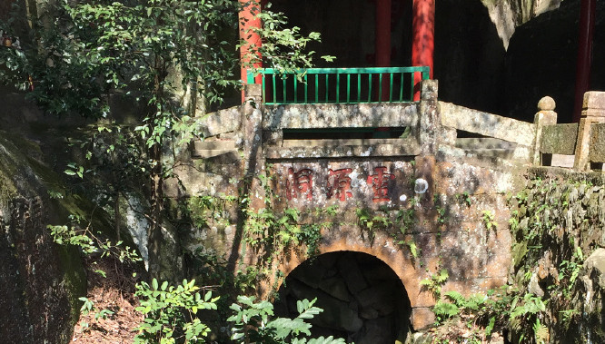 涌泉寺的东面,有一道石砌的拱门,匾额是“灵源深处”。于是,我们知道,这才是我们进涌泉寺的目的地。下了六十来级台阶,中间有一条宽约3米的山涧,这里就是灵源洞了。不知道鼓山属于什么地貌,这里的洞都不深,这个我们慕名而来的洞也才深10米左右,完全没有我们习惯的喀斯特地貌那样的光怪陆离。当然,灯光也是其中的一个重要原因,这里的洞都是原汁原味的。