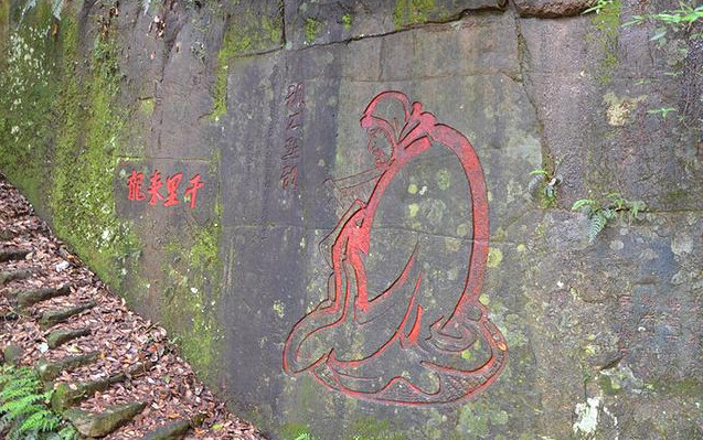 西南侧的岩壁上还有一幅摩崖造像,是近代画家李霞的巨幅绘画“顽石点头”,刻画的《十八罗汉渡江图》曾于1914年被选送巴拿马参加世界博览会,获优等奖章;1923年所绘的《函谷跨牛图》又在美国纽约赛会上获奖。