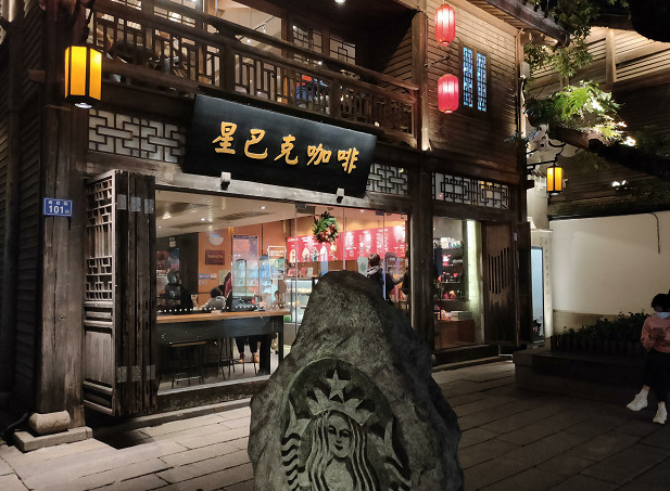 星巴克咖啡也入乡随俗,采用了福州当地的装修风格,显得十分古朴典雅。连标志性的LOGO,也是用石块雕刻的,一点都不显得违和。