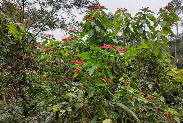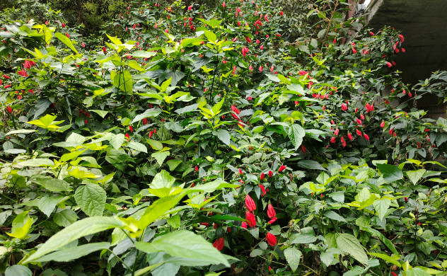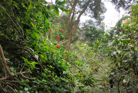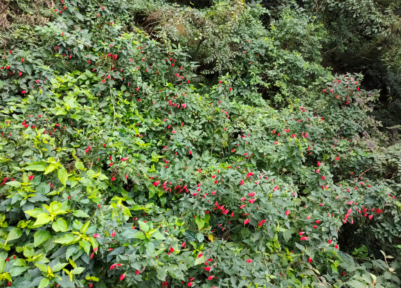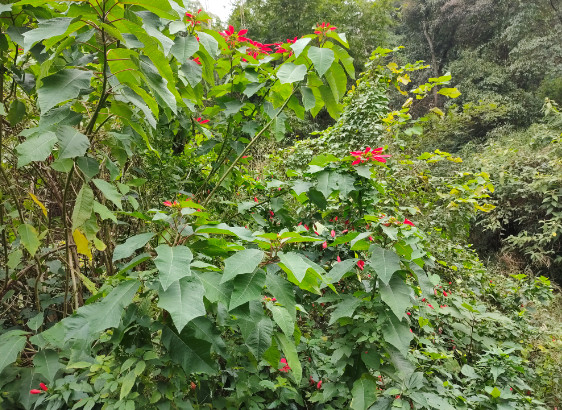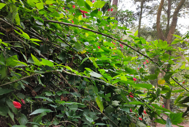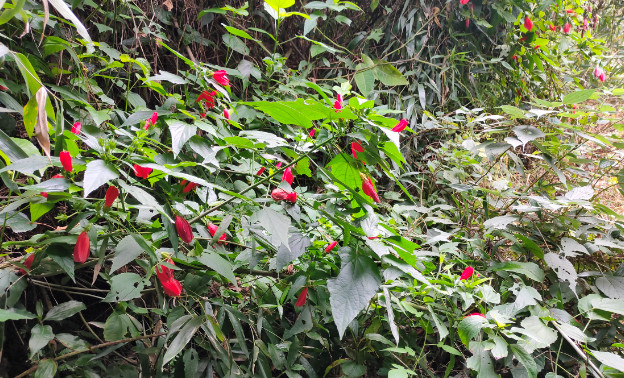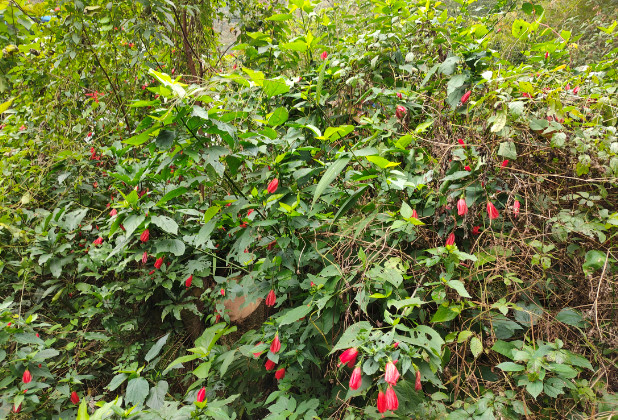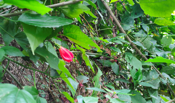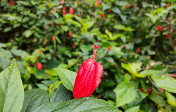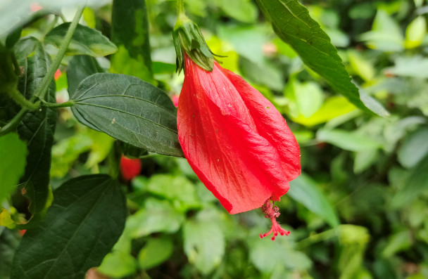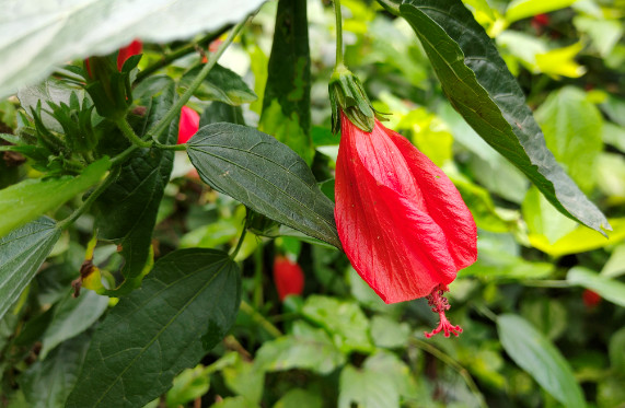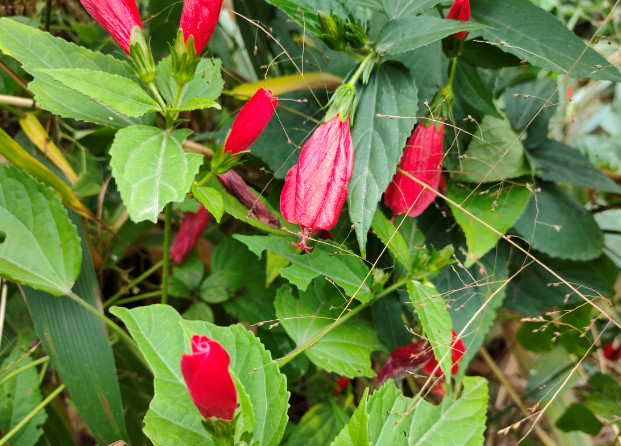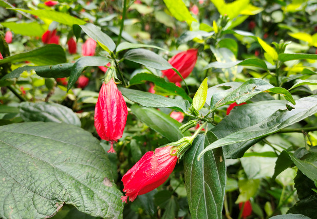 尽管江南朱瑾花并不盛行,其实朱瑾家族的成员并不少,全世界有超过三千个品种,称得上是花卉中的大家族了。其中不乏重瓣花型,还有其他颜色。不过梅里的这片朱瑾应该都是原生种,清一色都是大红色,很应了花名中“朱”字。即使它们闭合了轻薄的花瓣,也丝毫无损于它们的美丽。每一朵花都像一个小小的铃铛,透着玲珑可爱。