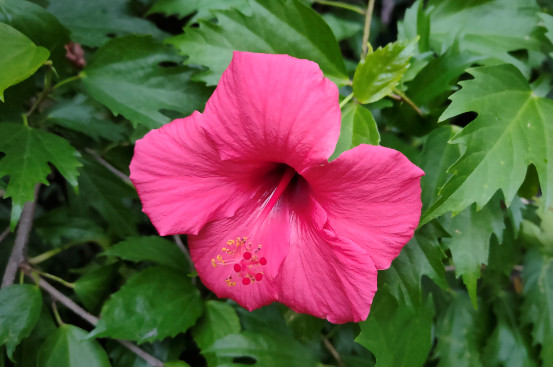 在江阴嘉茂花鸟园还没有关闭的时候,我也曾经尽情欣赏过朱瑾的身姿。不过那时候的朱瑾都是栽在花盆里,虽然那几个盆都挺大。梅里的朱瑾却仿佛长成了大树,即使它的枝干并不粗壮,可是十分高挑。花朵们红艳艳地挂在枝头,在浓绿中煞是可爱。