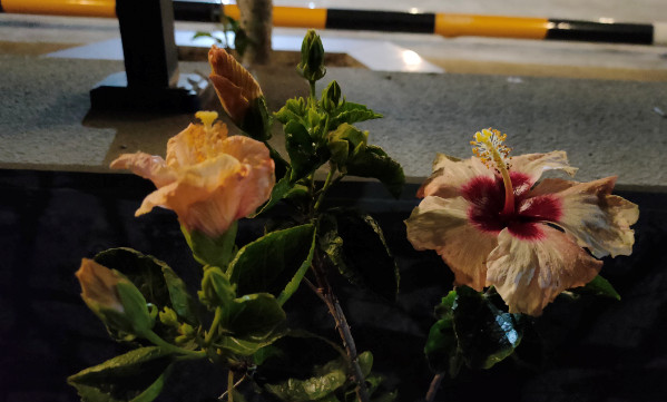 如果不是看到这片羞答答地闭合着花瓣的朱瑾花丛,我大概真没想到它居然是一种朝开暮合的花卉,原来它们晚上也是要睡觉的呢!不过有些品种应该并非这样,我们在将乐的花坛里,就看到大晚上还开足的朱瑾。