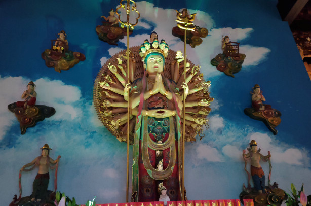 背后是一尊千手观音像,不过这个形象与其他寺庙的观音像似乎不太一样,有些过于严肃了些。四周是南海的各位菩萨,衬着蓝天白云。