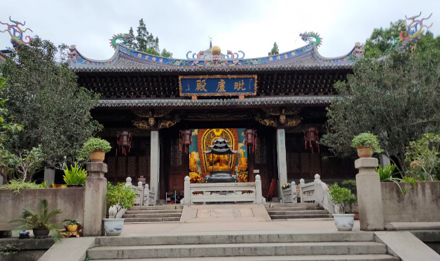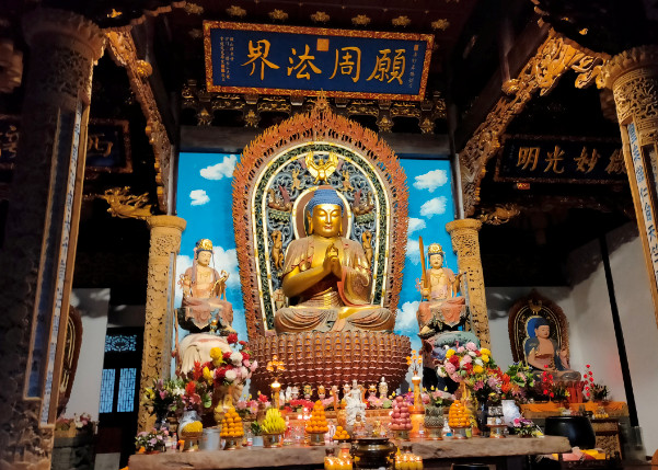 毗虚殿供奉如来佛祖,两侧有菩萨相侍,一骑白象一骑蓝狮,正是文殊和普贤。在菩萨莲座前还有几尊更小的菩萨像。这座殿规模很大,牌匾很多,应该是寺庙的主殿,类似于大雄宝殿的地位吧。