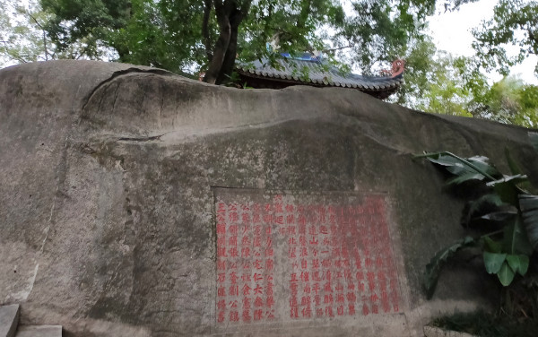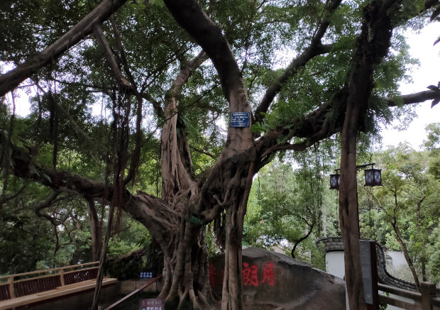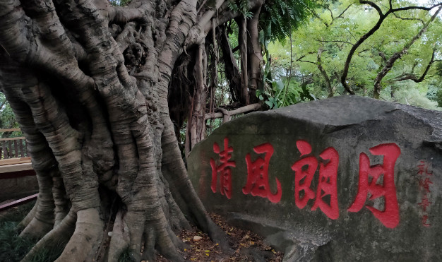 “月朗风清”摩崖石刻藏在一棵大榕树的后面,这棵古榕在福州名榕评选中名列第七。这块石刻是乾隆年间时任福州郡守的李拔所题,其实我开始的时候是从左往右读的,因为人家的落款就在右面,所以读成了“清风朗月”,似乎也挺顺口。