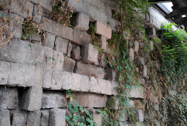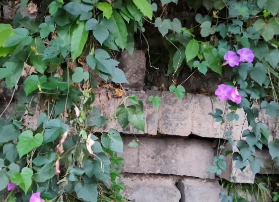风景区的外围还有一段明城墙遗址,地面上镌刻着城墙当年的规模,城墙被围在栅栏后面,只是一段遗存。城墙的年代久了,自然少不了各种植物,蓝色的牵牛花开得尤其漂亮,碧绿的叶子,绚丽的紫花,与古老的城墙竟然相得益彰。